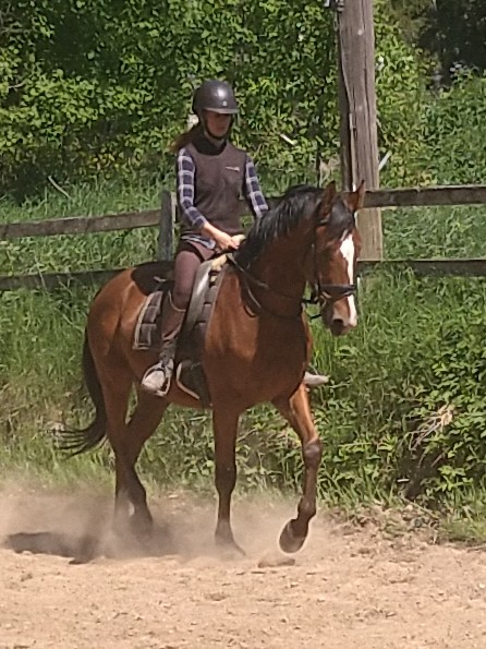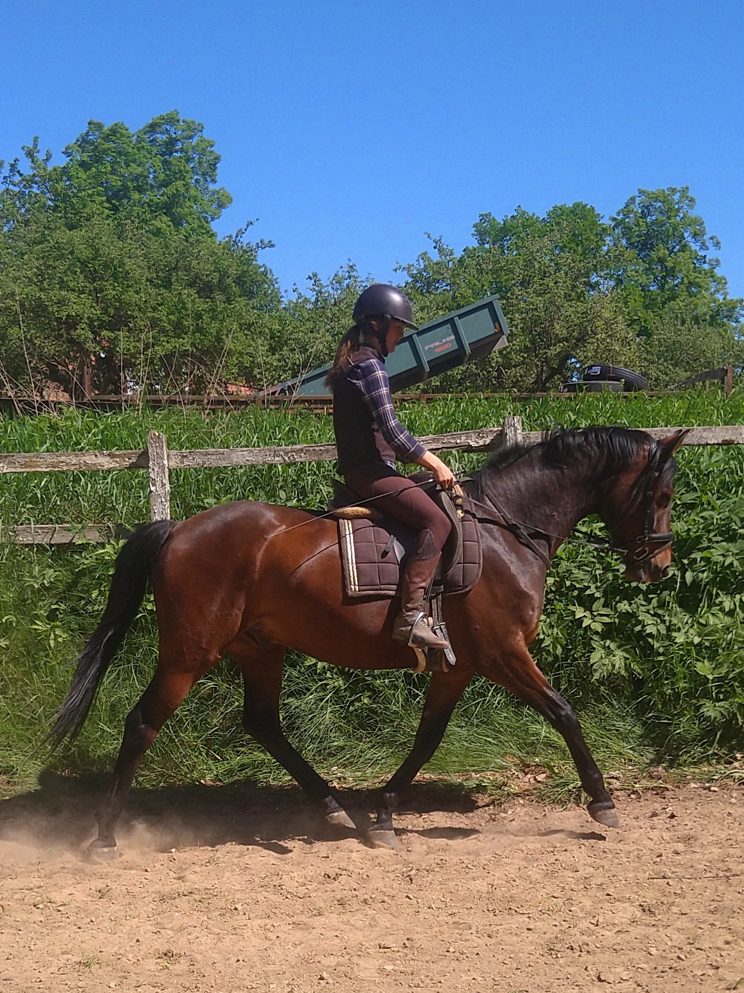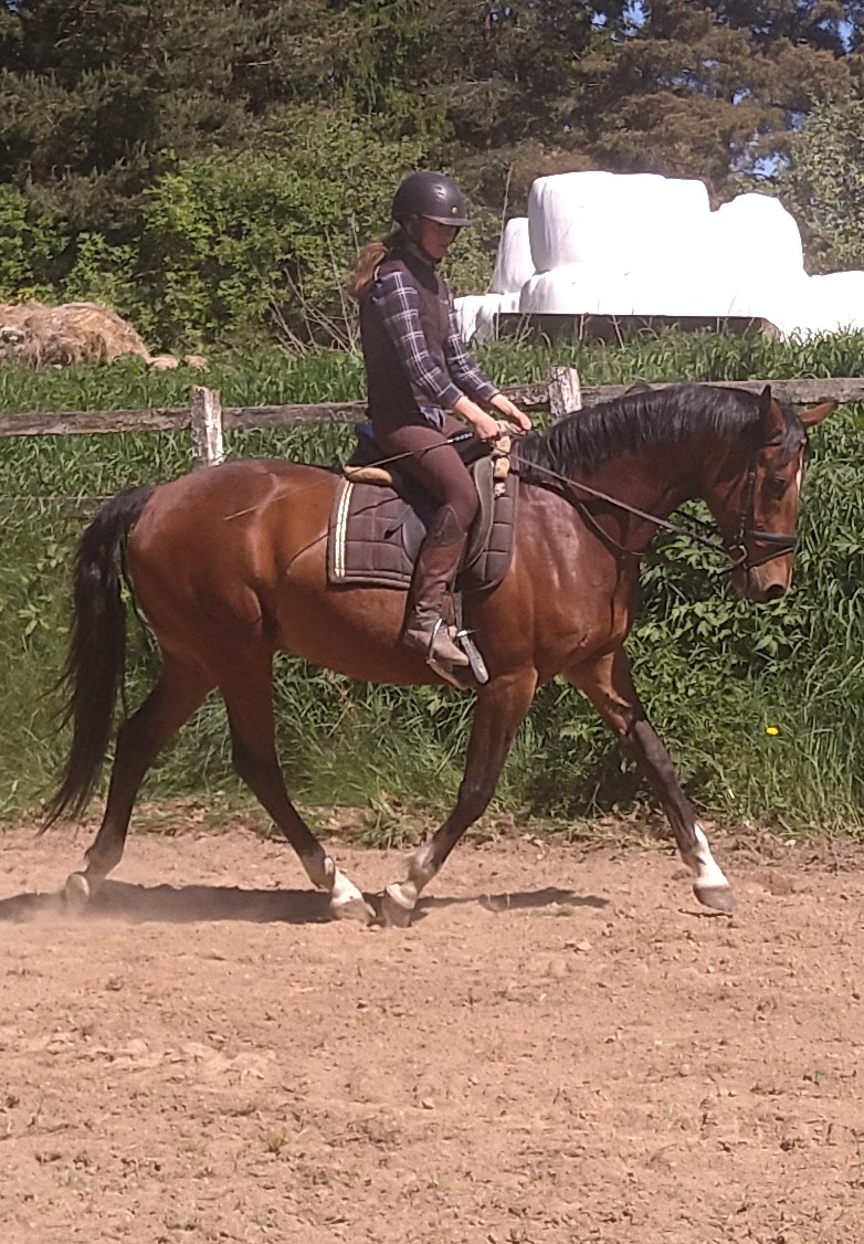 Valack f. 2000, brun, 167 cm. Helbror med ovanstående FG Zyjawo. Väl grundriden, flyttar sig för skänkeln, provat förvänd galopp osv. Mycket snäll och lugn i all hantering och ridning med goda, utvecklingsbara gångarter. Bild från sommaren -24